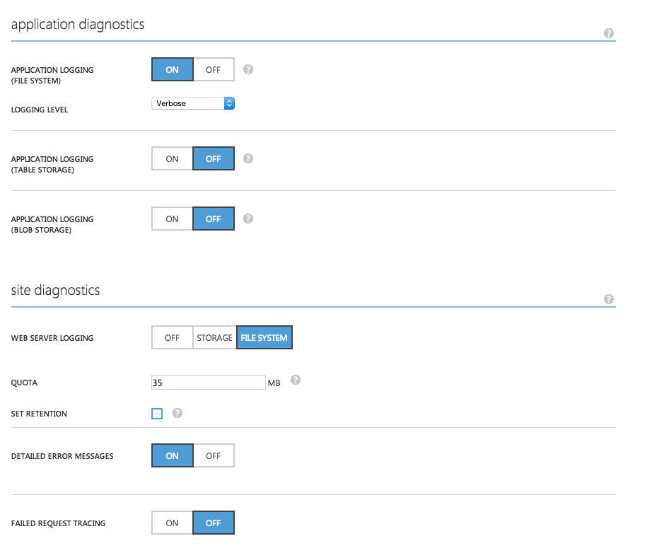 I enabled diagnostics in Azure Portal on the Website under the Configuration tab, scroll to the bottom. And set both application and site diagnostics on and to Verbose, see screen below.